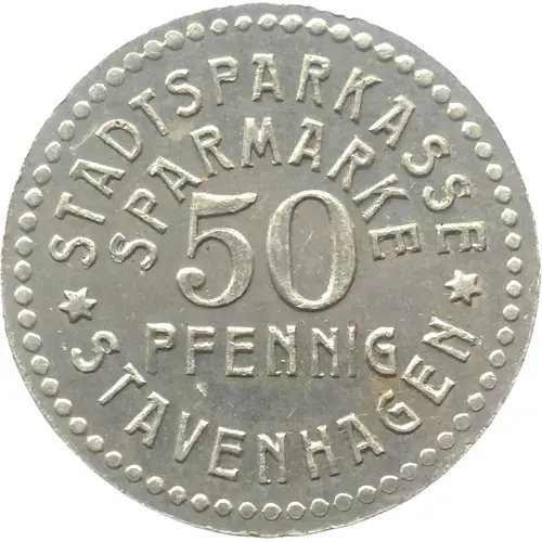 | Légende de l’avers | STADTSPARKASSE SPARMARKE 50 PFENNIG ✶ STAVENHAGEN ✶ |