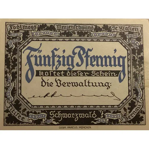 Lettering (regular font): Todtmoos Menzenschwand St.Blasien Titisee Bernau FÜNFZIG PFENNIG Kostet dieser Schein Die Verwaltung: Schwarzwald |