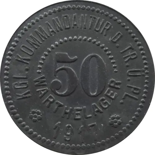 | Obverse lettering | KGL. KOMMANDANTUR D. TR. Ü. PL. 50 WARTHELAGER ✿ 1917 ✿ |