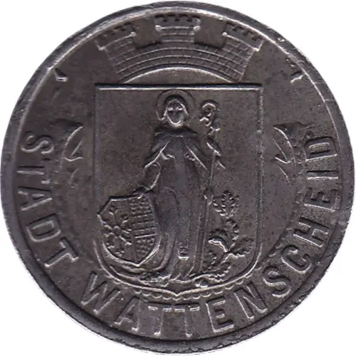 Artistry: Specific engraver details for this Wattenscheid issue are typically unrecorded, common for Notgeld. The stylistic approach prioritized clear functionality, often employing local designers. Designs were pragmatic, prominently displaying the city's name, denomination, and year. Lacking elaborate artistic flourishes, these pieces frequently incorporated simplified municipal symbols or heraldry, reflecting a utilitarian yet locally symbolic aesthetic driven by urgent currency needs.
