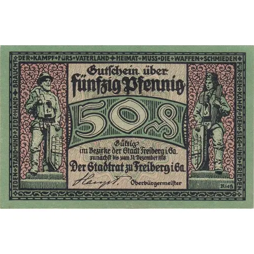 JEDEN STAND UND JEDE HAND - BRAUCHT DER KAMPF FÜRS VATERLAND - HEIMAT MUSS DIE WAFFEN SCHMIEDEN - FÜR DEN KAMPF, DEN SIEG UND FRIEDEN. Gutschein über fünfzig Pfennig 50 & Gültig im Bezirk der Stadt Freiburg i. Sa. zunächst bis zum 31. Dezember 1918 Der Stadtrat zu Freiberg i. Sa. Oberbürgermeister |