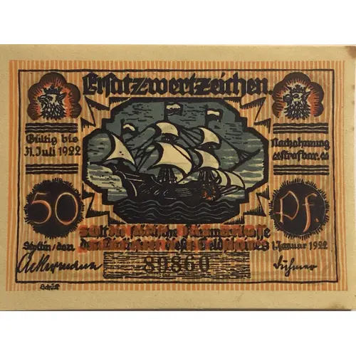 ERSATZWERTZEICHE Gültig bis 31.Juli 1922 Nachahmung Strafbar 50 Pf SO KNAPP DAS BROT SEEFAHRT IST NOT(Overprint text) Stettin den 1.Januar 1922 |