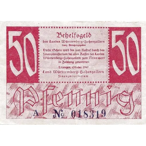 | Obverse lettering | Behelfsgeld des Landes Württemberg-Hohenzollern franz. Besatzungsgebiet Dieser Schein wird bis zum Aufruf durch das Finanzministerium bei allen Kassen des Landes Württemberg-Hohenzollern zum Nennwert in Zahlung genommen Tübingen, Oktober 1947 Land Württemberg-Hohenzollern Finanzministerium Pfennig (Translation: Substitute money of the state of Württemberg-Hohenzollern French Occupation area This note is valid until cancelled by the Ministry of Finance and will be taken in payment at all cash registers in the country Württemberg-Hohenzollern at face value Tübingen, October 1947 State of Württemberg-Hohenzollern Ministry of Finance) |