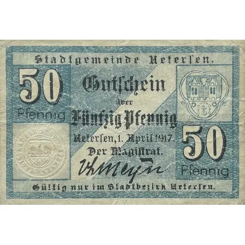 Stadtgemeinde Uetersen 50 Pfennig Gutschein über Fünfzig Pfennig Uetersen, 1. April 1917. Der Magistrat. 50 Pfennig Gültig nur im Stadtbezirk Uetersen (Translation: Municipality of Uetersen 50 Pfennigs Voucher for Fifty Pfennigs Uetersen, April 1, 1917. The Magistrate. 50 Pfennigs Valid only in the Uetersen District) |