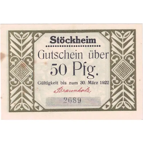 | Надписи лицевой стороны | Stöckheim Gutschein über 50 Pfg. Gültigkeit bis zum 30. März 1922 2689 |