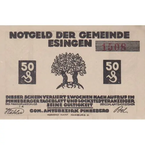Obverse lettering NOTGELD DER GEMEINDE ESINGEN 50 50 Pf Pf DIESER SCHEIN VERLIERT 2 WOGNEN HACH AUFRUF IM PINNERBERGER TAGEBLATT UND LOCKSTEDTERANZEIGER SEINE GULTIGKEIT DER FINANZAUSSCHUSS DERCOM ANTSVORSTENER I·A COM. AMTSBEZIRK PINNEBERG KONRAD MANF HAMBURG S.