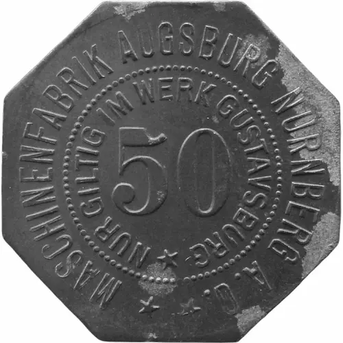 | Chữ khắc mặt trước | MASCHINENFABRIK AUGSBURG-NÜRNBERG A.G. ❀ ❀ NUR GILTIG IM WERK GUSTAVSBURG ❀ 50 |