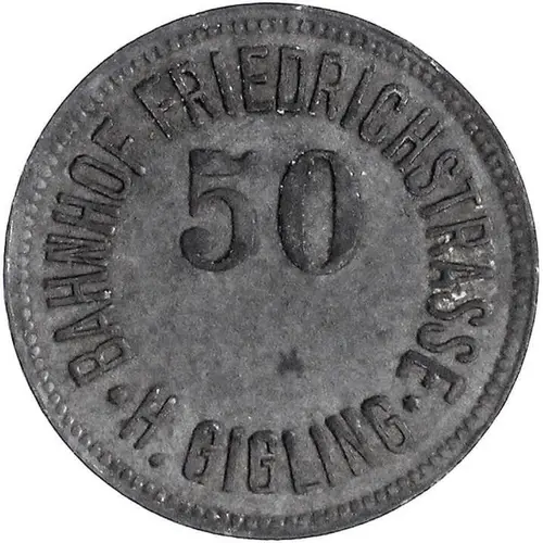 | Obverse lettering | BAHNHOF FRIEDRICHSTRASSE 50 H. GIGLING |