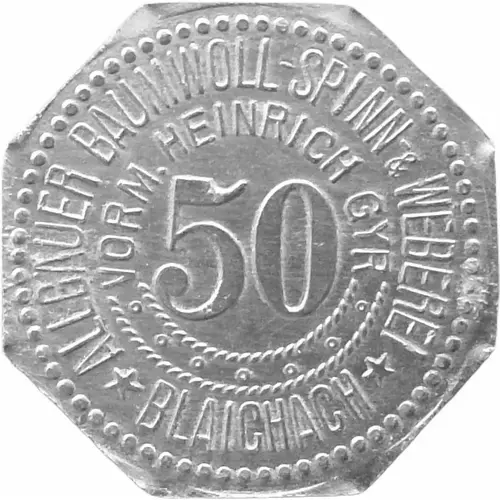 | Obverse lettering | ALLGÄUER BAUMWOLL-SPINN-& WEBEREI VORM. HEINRICH GYR 50 BLAICHACH |