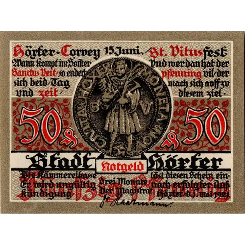 Höxter-Corvey 15. Juni. St. Vitusfest Mann kompf im Sommer Sanctus Veit, so endet sich beid Tag und Zeit und wer dan hat der Pfennig vil, der nach sich auff zu diesem Ziel. 50 50 Stadt Höxter Notgeld Die Kämmereikasse löst diesen Schein ein Er wird ungültig drei Monate nach erfolgter Auf- kündigung durch den Magistrat Höxter d. 13. Mai 1921 (Translation: Höxter-Corvey, June 15. St. Vitus Festival When Saint Vitus comes in summer, then both day and time come to an end, and he who then has many pennies shall keep them safe until this time. The treasury will redeem this note. It becomes invalid three months after official notice by the city magistrate of Höxter, May 13, 1921.) |
