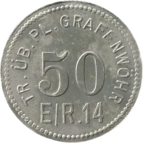 Artistry:Typical of Notgeld, this 50 Pfennigs design prioritizes function over elaborate artistry. A specific engraver is almost certainly unrecorded for such utilitarian wartime emissions. The stylistic approach would be direct and unadorned. Legends like "Grafenwöhr TR. ÜB. PL. E/R. 14" would form the core design, likely on the reverse, with the obverse stating denomination and issuer. Such designs reflect urgent circumstances, focusing on legibility rather than intricate allegories.