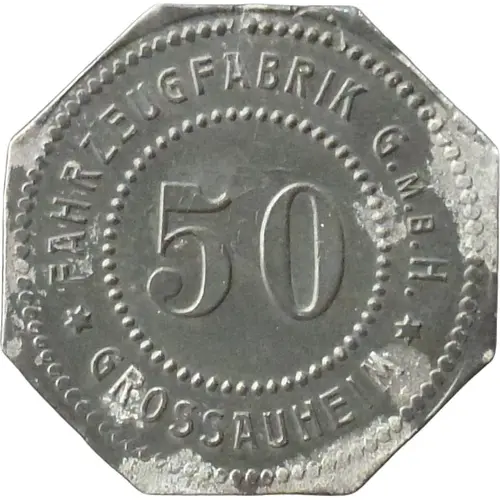 | Obverse lettering | FAHRZEUGFABRIK G.M.B.H. 50 GROSSAUHEIM |