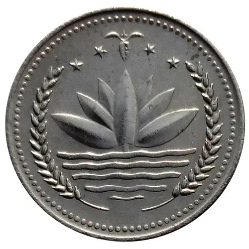 Artistry: The design, likely by the Bangladesh Bank's internal team, embodies a post-colonial nationalistic style. The obverse proudly displays the newly adopted National Emblem of Bangladesh: the Shapla (water lily) on water, flanked by two ears of rice, surmounted by three connected jute leaves and four stars. The reverse presents the denomination "50 POISHA" in both Bengali and English, along with the year "1973", flanked by two Hilsa fish, symbolizing the nation's rich aquatic resources.