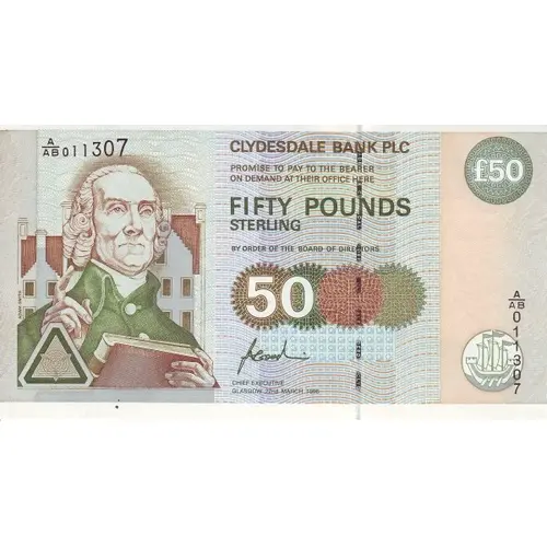 Clydesdale Bank PLC Promise to pay the bearer on demand at their office here Fifty Pounds Sterling by order of the Board of Directors |