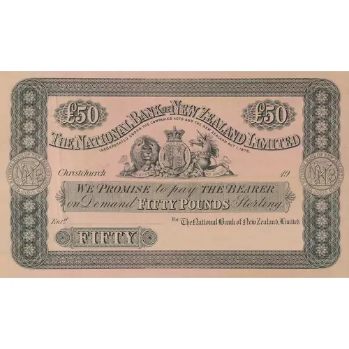 | Obverse lettering | THE NATIONAL BANK OF NEW ZEALAND LIMITED INCORPORATED UNDER THE COMPANIES ACTS AND THE NEW ZEALAND ACT 1. 1873 WELLINGTON WE PROMISE TO PAY THE BEARER ON DEMAND FIFTY POUNDS STERLING FOR THE NATIONAL BANK OF NEW ZEALAND LIMITED FIFTY |