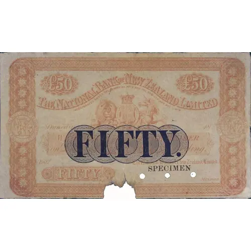 | Obverse lettering | THE NATIONAL BANK OF NEW ZEALAND LIMITED INCORPORATED UNDER THE COMPANIES ACTS AND THE NEW ZEALAND ACT 1.1873 DUNEDIN WE PROMISE TO PAY THE BEARER ON DEMAND FIFTY POUNDS STERLING FOR THE NATIONAL BANK OF NEW ZEALAND LIMITED FIFTY |