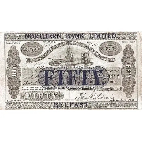 | نوشتههای روی اسکناس | Northern Bank Limited Formerly Northern Banking Company Limited I promise to pay the bearer on demand at the bank or any of its branches Fifty Pounds British, value received, Belfast |