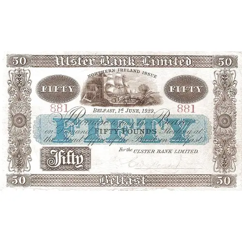 | نوشتههای روی اسکناس | Ulster Bank Limited Northern Ireland Issue I Promise to pay the Bearer on Demand Fifty Pounds Sterling at the Head Office of the Bank in Belfast For the Ulster Bank Limited Belfast |