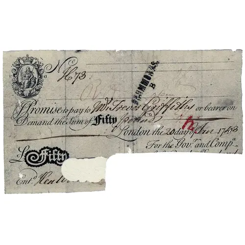 | Obverse lettering | No. 152 I Promise to pay to _ or bearer on Demand the sum of FIFTY Pounds London the 20 day of Jan 1748. For the Gov:r and Comp.a £FIFTY [Bank of England] Ent.d |