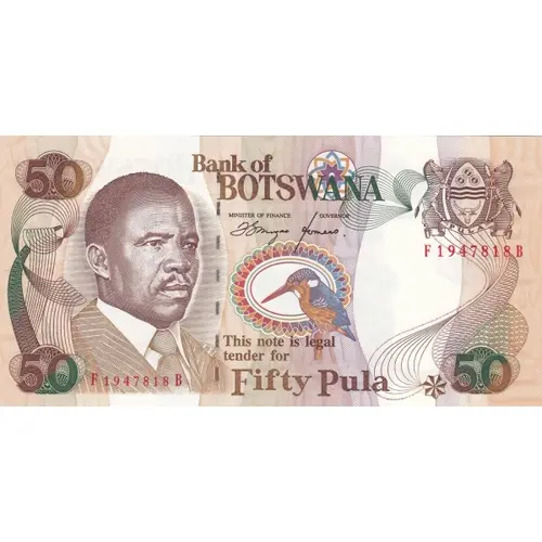 | Obverse lettering | Bank of Botswana. This note is legal tender for fifty pula |