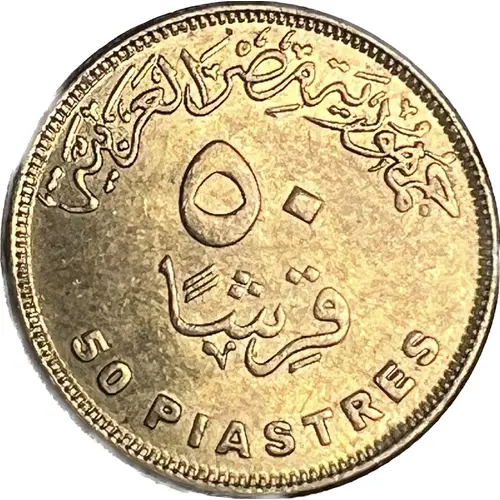 | Obverse lettering | جمهورية مصر العربية ٥٠ قرشاً 50 PIASTRES (Translation: The Arab Republic of Egypt 50 Qirsh 50 Piastres) |