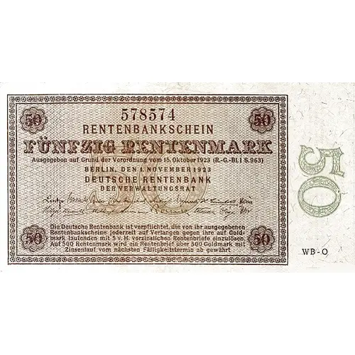 | Obverse lettering | Rentenbankschein Fünfzig Rentenmark Ausgegeben auf Grund der Vorordnung vom 15. Oktober 1923 (R.-G.-Bl. I S. 963) Die Deutche Rentenbank ist verplichtet, die von ihr ausgegebenen Rentenbankscheine jederzeit auf Verlangen gegen ihre auf Goldmarklautenden mit 5 v. H. verzinslichen Rentenbriefe einzulösen. Auf 500 Rentenmark wird ein Rentenbrief über 500 Goldmark mit zinsenlauf vom nächsten fälligkeitstermin ab gewährt. Berlin, den 1. November 1923 Deutsche Rentenbank Der Verwaltungsrat (Translation: Rentenbank Note Fifty Rentenmark Issued according to the order of the 15th of October 1923 The German Rentenbank is obliged to exchange the Rentenbank notes it has issued, at any time upon request, for its Goldmark denominated 5% interest-bearing annuity letters. For every 500 Rentenmark, a bond is granted for 500 Goldmark with interest accruing from the next due date. Berlin, 1st November 1923 German Rentenbank Board of Directors) |