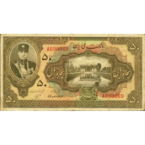 | Obverse description | Olive-green on multicolor underprint. Portrait Reza Shah with high cap full face at left; Chehel Sotoun (Palace of the Forty Columns) at center. |
