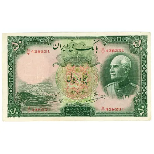 | Obverse description | Green on multicolor underprint. Portrait Shah Reza in three-quarter face towards left without cap at right; Mount Damavand at left. Serial # in Western or Persian numerals. |
