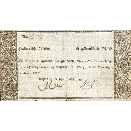 No. 2521 Halvtredſindstyve Rigsbankdaler R. B. Dette Beviis, gjeldende for 50 Rbdlr. Navne = Værdie, Modtages i alle offentlige Kasſer og Oppebørſeler i Norge, indtil Slutningen af Aaret 1815. Udſtædt efter høieſte Befaling. |