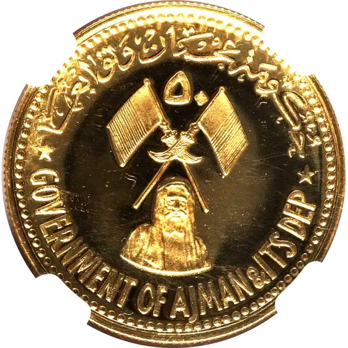 | Obverse description | State emblem in the middle, denomination 5 in Arabic above, and Government of Ajman & Its Dep in Arabic on top and in English below. Bust of Sheikh Rashid Bin Humaid Al Nuaimi below emblem, facing straight ahead |