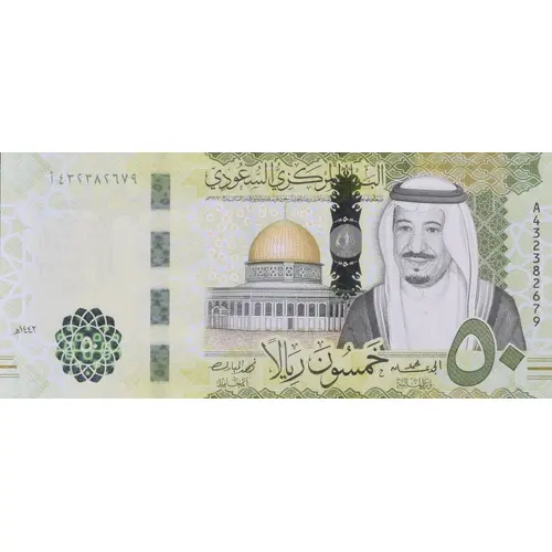 البنك المركزي السعودي طبعت في عهد خادم الحرمين الشرفين الملك سلمان بن عبدالعزيز آل سعود بموجب المرسوم الملكي رقم ٦ الصادر بتاريخ ١٣٧٩/١/٧هـ ٥٠ وزير المالية خمسون ريالاً المحافظ (Translation: Saudi Central Bank Printed during the reign of the Custodian of the Two Holy Mosques, King Salman bin Abdulaziz Al Saud, pursuant to Royal Decree No. 6 issued on 1/7/1379 AH 50 Minister of Finance Fifty Riyals Governor) |