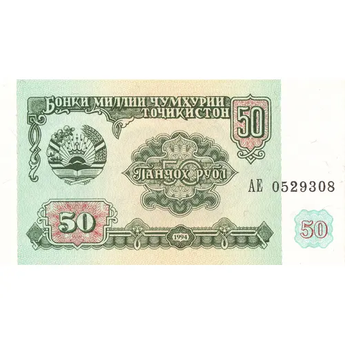 | Legenda del dritto | БОНКИ МИЛЛИИ ҶУМҲУРИИ ТОҶИКИСТОН Панҷоҳ 50 рубл 1994 (Translation: National Bank of the Republic of Tajikistan, Fifty Rubles) |