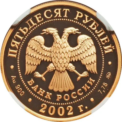 | Obverse lettering | ПЯТЬДЕСЯТ РУБЛЕЙ БАНК РОССИИ • Au 900 • 2002 г. • 7,78 ММД • (Translation: Fifty Roubles Bank of Russia MMD) |
