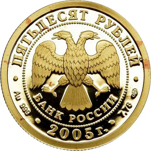 | توضیحات روی سکه | In the centre – the Emblem of the Bank of Russia [the two-headed eagle with wings down, lower – the semicircular inscription – «БАНК РОССИИ» (BANK OF RUSSIA)] framed by a circle of dots and inscriptions along the rim: at the top – «ПЯТЬДЕСЯТ РУБЛЕЙ» (FIFTY ROUBLES), at the bottom – the year of issue «2005», the letters to the left indicate the metal sign and the fineness, to the right – the fine metal content and the mint trade mark. |