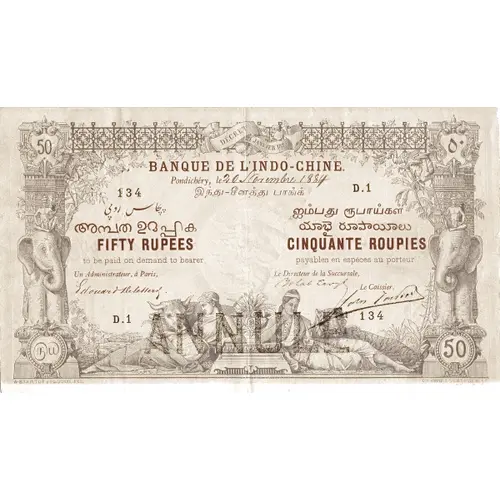 BANQUE DE L`INDOCHINE CINQUANTE ROUPIES FIFTY RUPEES A. BRAMTOT ET G DUVAL FEC. CH - WULLSCHLEGER SC. |