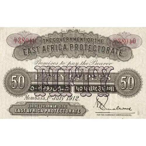 | Leyenda del anverso | THE GOVERNMENT OF THE EAST AFRICA PROTECTORATE PROMISES TO PAY THE BEARER ON DEMAND THE SUM OF FIFTY RUPEES FOR THE GOVERNMENT OF THE EAST AFRICA PROTECTORATE |