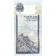 Pale green, and black print. Butterflies above temple ruins, with shield and ornamental sword hilt in low foreground in vertical format. |