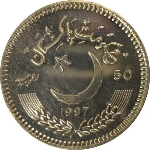 | Obverse description | The waxing crescent moon and five-pointed star facing North West in rising position is in the center. Wording `حكومت پاکستان` in Urdu script on top. Below the crescent and at the top of two springs of wheat with arms curved upward. Year 1997 above the wheat springs. The face value of the coin in numeral “50” in bold letters and `RUPIA`, `روپیہ` in Urdu script are written on the right and left sides of the crescent star respectively. |