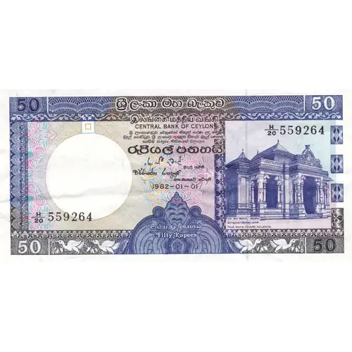ශ්රී ලංකා මහ බැංකුව இலங்கை மத்திய வங்கி CENTRAL BANK OF CEYLON. ශ්රී ලංකාණ්ඩුව වෙනුවෙන් නිකුත් කරන ලද මේ මුදල් නෝට්ටුව ශ්රී ලංකාව ඇතුළත ඕනෑම මුදල් ගණනක් ගෙවිම සඳහා නිතියෙන් වලංගුය රුපියල් පනහයි රජ මහා විහාරය, කැලණිය இராஜமகாவிஹர, களனி RAJA MAHA VIHARE, KELANIYA ஐம்பது ரூபாய் FIFTY RUPEES |
