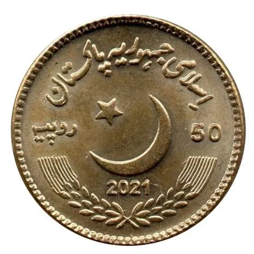 | Obverse description | The waxing crescent moon and five-pointed star facing North West in rising position is in the center on the obverse side of the coin. The words “ISLAMI JAMHORIA PAKISTAN” , `اسلامہ جمہوریہ پاکستان` in Urdu script are inscribed along with periphery on the top of the crescent star whereas the year of issuance i.e. 2021 is written below the crescent and at the top of two springs of wheat with arms curved upward. The face value of the coin in numerical “50” in bold letters and `RUPIA` , `روپیہ` in Urdu script are written on the right and left sides of the crescent star respectively. |