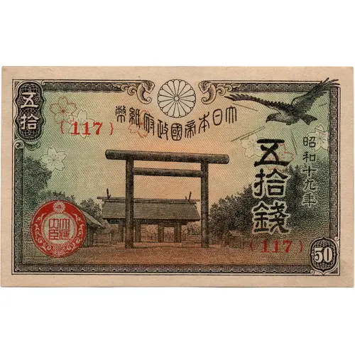 | Obverse lettering | 五 幣紙府政國帝本日大 拾 {117} 五 昭 拾 和 錢 十 大大 九 臣藏 年 {117} 50 (Translation: 50 Great Imperial Japanese Government Note Fifty sen Finance Minister Year 19 of Shōwa) |