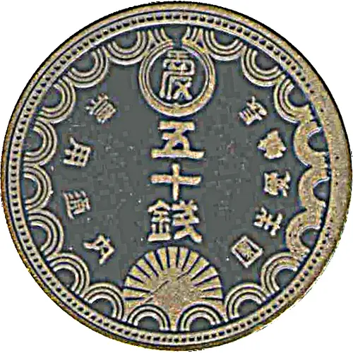 | Obverse description | Badge of Aisei En above denomination. Sylized waves on the edge, text left and right of value and sun at the bottom. |
