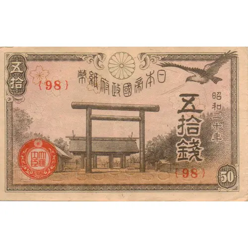 | Obverse lettering | 五 幣紙府政國帝本日 拾 {98} 五 昭 拾 和 錢 二 十 大大 年 臣藏 {98} 50 (Translation: 50 Imperial Japanese Government Note Fifty sen Finance Minister Year 20 of Shōwa) |