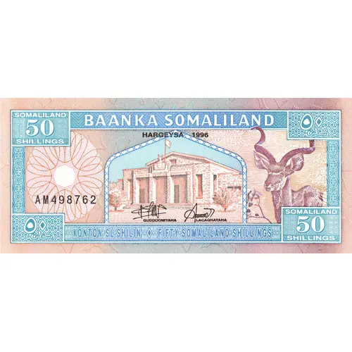 | Legenda del dritto | BANKAA SOMALILAND KONTON SL SHILIN SOMALILAND 50 SHILLINGS ٥٠شن (Translation: Bank of Somaliland Fifty Somaliland Shillings) |