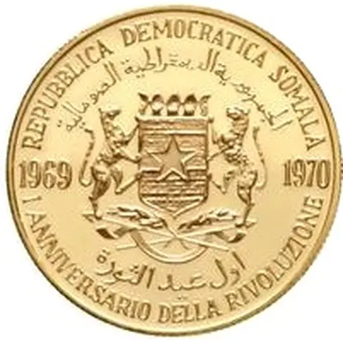Obverse lettering REPUBLICA DEMOCRATICA SOMALIA 1969 1960 1 ANNIVERSARIO DELLA RIVOLUZIONE
