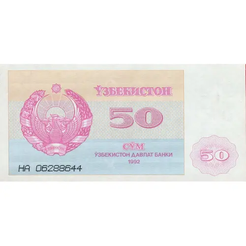 Obverse lettering ЎЗБЕКИСТОН 50 СЎМ ЎЗБЕКИСТОН ДАВЛАТ БАНКИ 1992