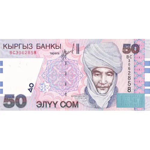 | Obverse lettering | КЫРГЫЗ БАНКЫ 50 ЭЛҮҮ СОМ (Translation: Bank of Kyrgyzstan, Fifty Som) |