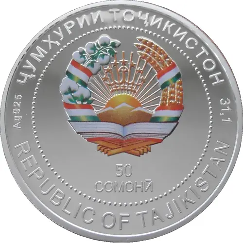 | Chữ khắc mặt trước | ҶУМҲУРИИ ТОҶИКИСТОН Ag 925 31,1 REPUBLIC OF TAJIKISTAN 50 СОМОНӢ (Translation: Republic of Tajikistan 50 Somoni) |
