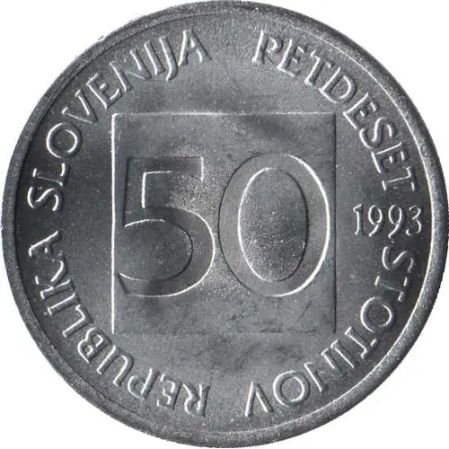 | Chữ khắc mặt trước | REPUBLIKA SLOVENIJA PETDESET STOTINOV 50 1993 (Translation: Republic of Slovenia Fifty Stotinov 50 1993) |