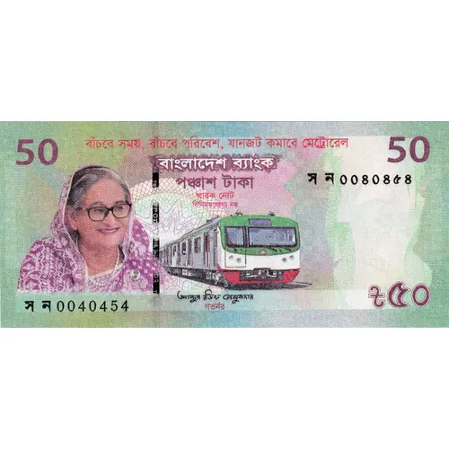 বাঁচবে সময়, বাঁচবে পরিবেশ, যানজট কমাবে মেট্রোরেল বাংলাদেশ ব্যাংক 50 পঞ্চাশ টাকা স্মারক নোট বিনিময়যোগ্য নয় FIFTY TAKA ৫০ (Translation: Metro Rail Saving Time, Saving Environment, Reduce Traffic Bangladesh Bank Fifty Taka Commemorative Note Not Legal Tender) |